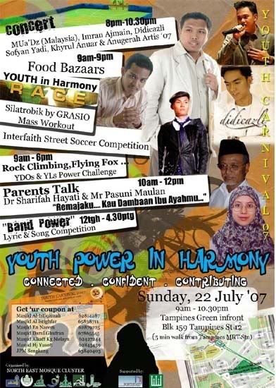 ![]() Oleh Amirul Putra Penulis Sambilan SATU karnival yang memberi peluang para belia berinteraksi akan diadakan esok di Tampines Green, berhadapan Blok 159, Tampines Street 12. Bertemakan Kuasa Belia: Berhubung, Yakin, Menyumbang, ia memberi peluang kepada para pemimpin belia daripada masjid-masjid Al-Istighfar, Darul Ghufran, Alkaff Kampong Melayu, Al-Istiqamah, En-Naeem, Masjid Haji Yusoff dan Jawatankuasa Pembinaan Masjid Sengkang daripada Rumpun Masjid Timur Laut (NEMC) mendekati dan mendapatkan penyertaan para belia di kawasan sasaran tempat karnival itu diadakan. Selain ceramah, terdapat acara bola sepak gelanggang, sukan memanjat tembok, silatrobik bersama Persatuan Grassio Singapura, perlumbaan harmoni belia sempena Hari Keharmonian Kaum dan pertandingan menggubah lagu untuk band. Acara nyanyian akan diserikan oleh Imran Ajmain, Didicazli, Hyrul Anuar, Md Aliff Aziz (juara Anugerah 2007), Sofyan Yadi dan Mu'adz. Turut diadakan ialah ceramah menarik berjudul Remajaku, Kau Dambaan Ibu Ayahmu yang dijangka menarik perhatian remaja. Permainan yang melibatkan penyertaan ibu bapa dan anak-anak mereka akan juga diadakan. Acara berlangsung dari 9 pagi hingga 10.30 malam. Sumber dari: Berita Harian, Sabtu, 21hb Julai 2007 ![]() Jumpa anda di sana! |